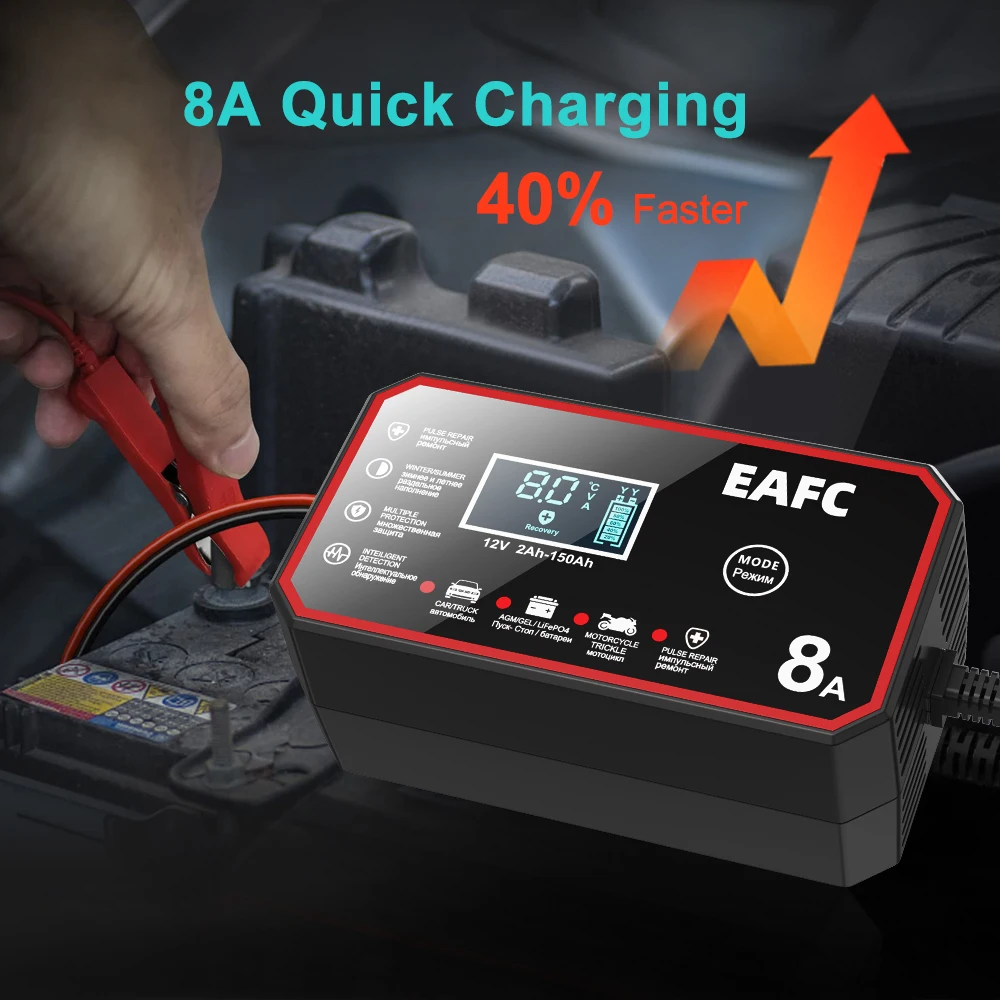 The EAFC RJ-C120801A 8A 12V Smart Car Battery Charger is a game-changer in battery care and maintenance. Designed with advanced automatic pulse repair technology, it works wonders on prolonging the life of your car, truck, SUV, motorcycle, or boat battery. Whether you’re dealing with lead-acid, lithium-ion, or LiFePO4 batteries, this charger ensures consistent performance and efficient charging. With its state-of-the-art technology, it detects battery health instantly and adapts accordingly, giving you peace of mind every time you charge.